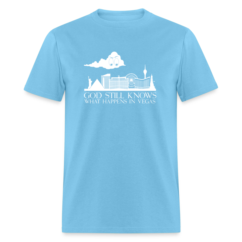 Remind your friends that "God still knows what happens in Vegas". This funny but true shirt is sure to turn heads and maybe even produce a chuckle.